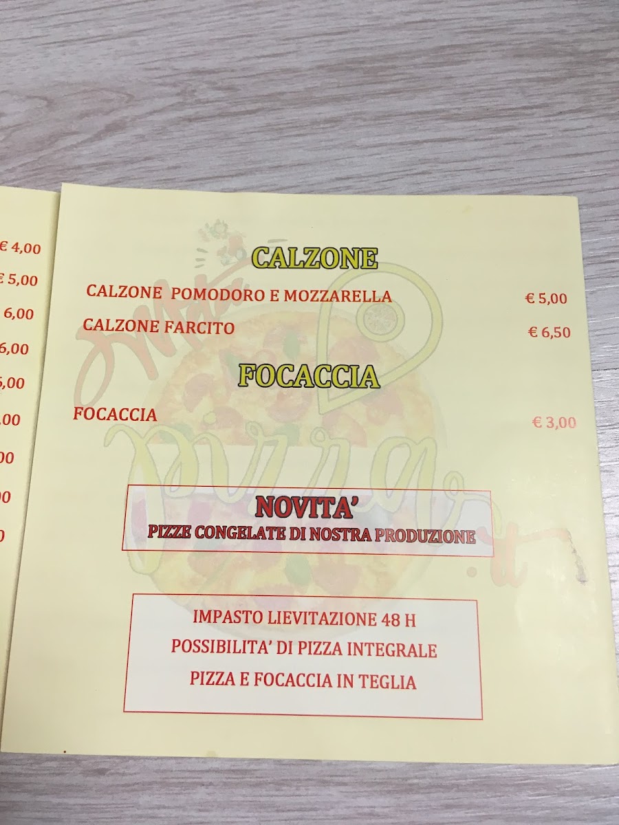 The menu offers a variety of pizzas available for takeaway, reflecting a blend of traditional and artisanal styles. Focused primarily on pizza, the offerings include different doughs and toppings, showcasing some house specialties. The menu is suitable for casual dining or quick meals, with options designed to cater to those seeking either a light bite or a more filling meal.